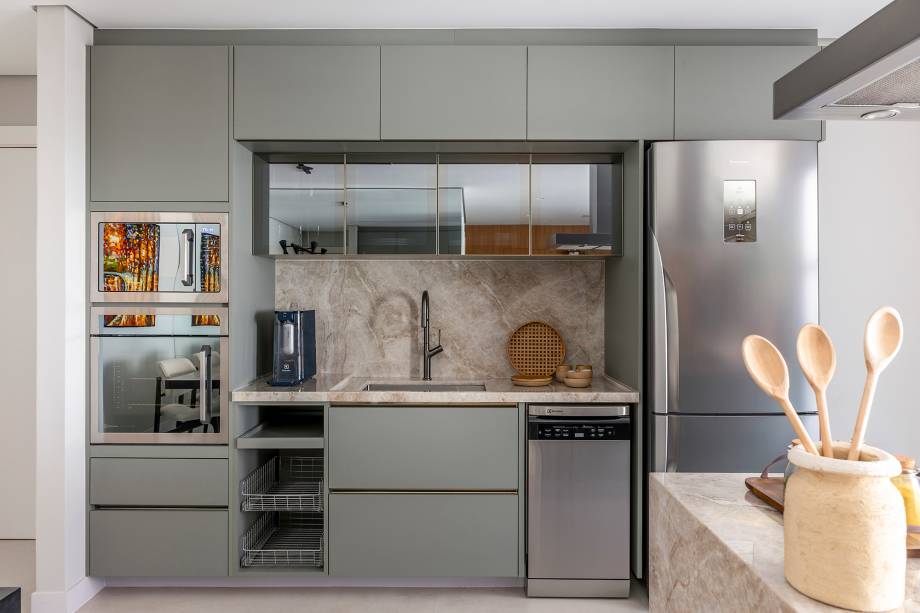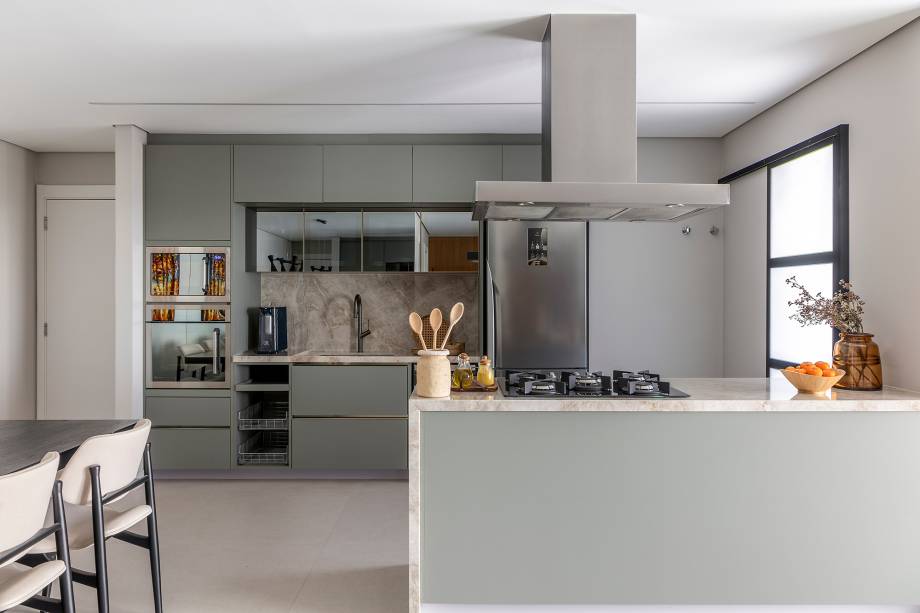 Um detalhe importante fica nas bancadas da cozinha: a pedra é um quartzito do nordeste do Brasil, original do Ceará, que se chama Taj Mahal. “Ele está aqui no acabamento polido. Tem um pouco de brilho, mas os clientes preferiram assim. É uma das pedras mais usadas hoje em dia nos projetos”, conta Adriana.