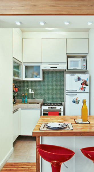 Quando o namoro à distância completou o primeiro aniversário, a jornalista carioca Flávia Belaciano e o arquiteto norte-americano Chad Nicholson decidiram viver mais próximos. Aliás, bem mais próximos! Assim que o moço topou se mudar para o Rio de Janeiro, a dupla buscou um mesmo teto. O endereço escolhido foi um apartamentinho da mãe de Flávia, até então alugado para uma astróloga. As medidas compactas não assustaram, mas uma reforma se provou necessária. “Do jeito que estava, não havia condições de morar ali: as paredes estavam pintadas de azul e a dinâmica era a de um consultório”, conta Flávia. O projeto, obviamente, ficou a cargo de Chad, que uniu ambientes, clareou a área e trouxe soluções de marcenaria para aproveitar ao máximo cada centímetro.