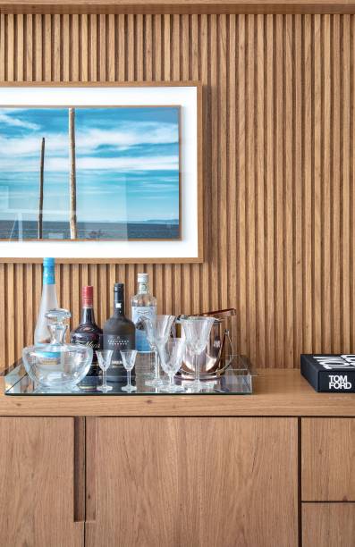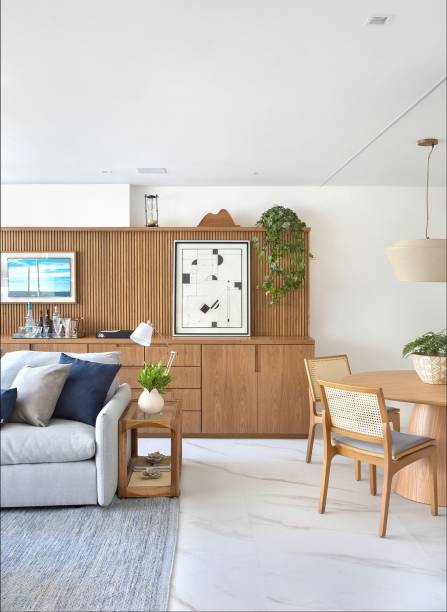 Na área social, Carmen Zaccaro destaca a parede ao fundo da sala, o móvel com dupla função (buffet e bar) desenhado por ela e executado em marcenaria, com portas, gavetas e local para adega e cervejeira.