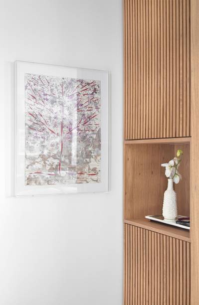 No novo projeto, toda a decoração é nova – do mobiliário aos tapetes, passando pelas obras de arte, marcenaria, objetos/adornos, luminárias, cortinas, revestimentos de parede, louças e metais, bancadas etc. Apenas o piso do apartamento, em porcelanato branco, foi mantido, pois estava em perfeito estado.