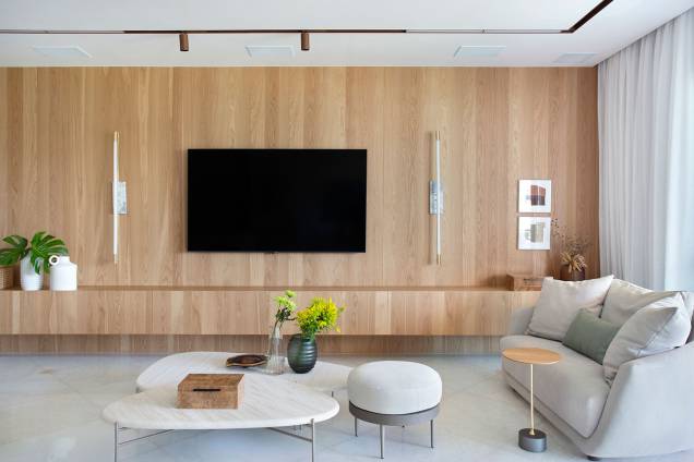 Os painéis em madeira, com aparência de carvalho, também são um elemento bastante presente no projeto. Além da parede da TV, revestem paredes e teto do hall de entrada, camuflando o acesso aos outros cômodos.