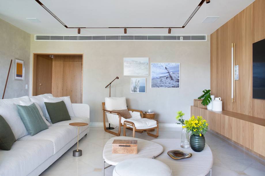 Um detalhe curioso foi a opção dos moradores por não colocar tapetes na área social. “Como vão muito à praia, o tapete atrapalharia a limpeza da areia. Além disso, o piso frio ajuda a amenizar as temperaturas mais elevadas do Rio de Janeiro”, justifica a arquiteta.