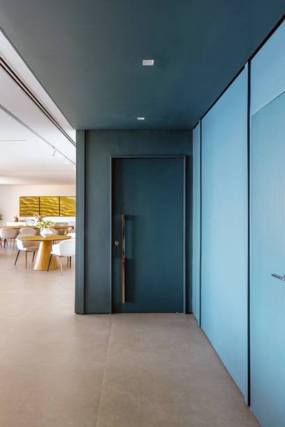 No quesito “paleta de cores, materiais e acabamentos”, foi adotada uma base neutra em todo o apartamento, exceto no hall de entrada, que foi pintado de verde azulado (cor Volta ao Mundo, da Suvinil), inclusive o teto e a porta “mimetizada”, criando, assim, um efeito de “caixa”. Na decoração, no geral, as cores são variações do próprio verde e aparecem pontualmente em acessórios, adornos, quadros e estofamentos para não pesar visualmente nem cansar com o tempo. Já na varanda, predominam tons de cinza, bege e verde.