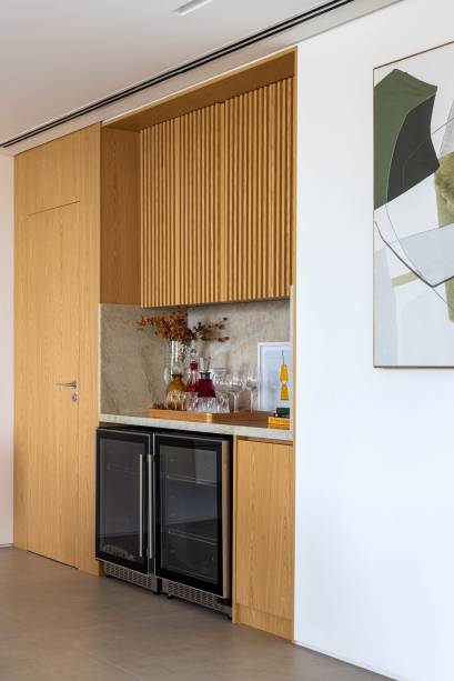 Na decoração, é tudo novo, com exceção do lustre pendente de Murano (que hoje está na copa) e a mesa de centro do wine space (com base de mármore maciço e tampo de vidro), que já faziam parte do acervo dos clientes e foram aproveitados.