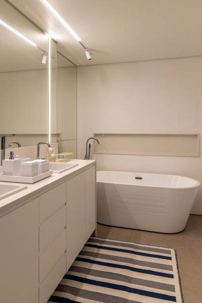 No geral, o projeto buscou criar uma atmosfera carioca contemporânea e atemporal, começando pelo uso do mesmo piso (em porcelanato cinza acetinado, de grandes dimensões) em todo o apartamento, com exceção dos quartos, que já tinham tábuas corridas de madeira sob o laminado existente e foram restauradas para deixar os dormitórios mais acolhedores.