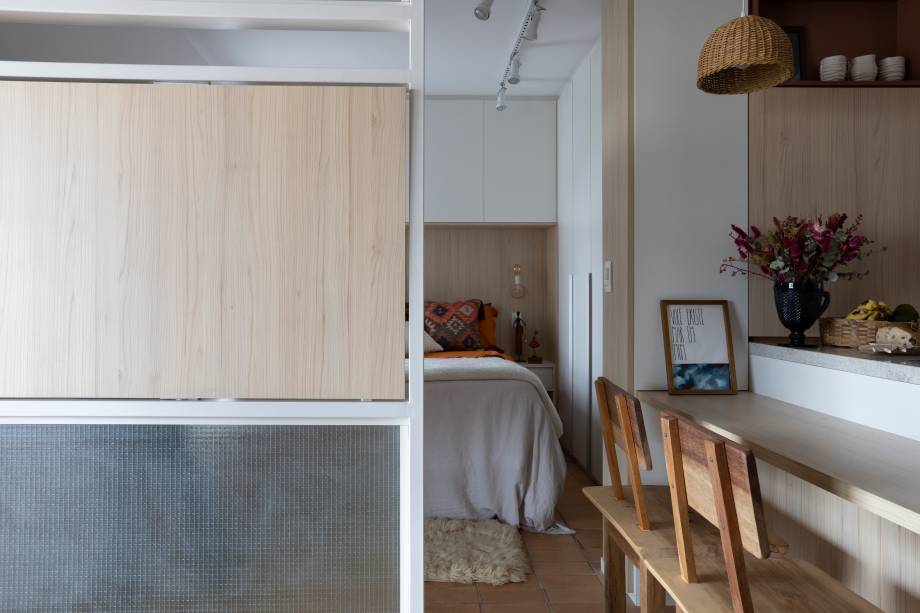 “A estrutura quase não mudou, o apartamento é bem pequeno. Apenas criamos uma península com balcão para facilitar para cozinhar e receber os amigos”, contam os profissionais do escritório Vinícia Brandão Arquitetura, que assinou o projeto.