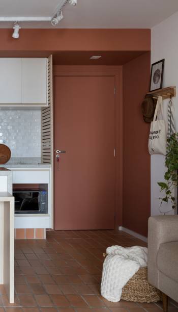 Com piso de lajota cerâmica em todos os ambientes e tons terrosos, o apartamento recebeu um estilo rústico, integrado e multifuncional.