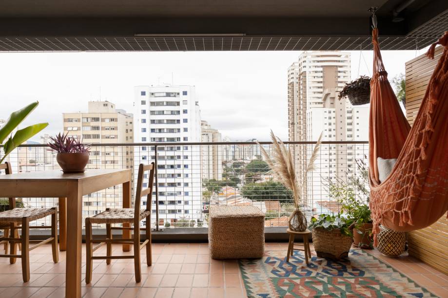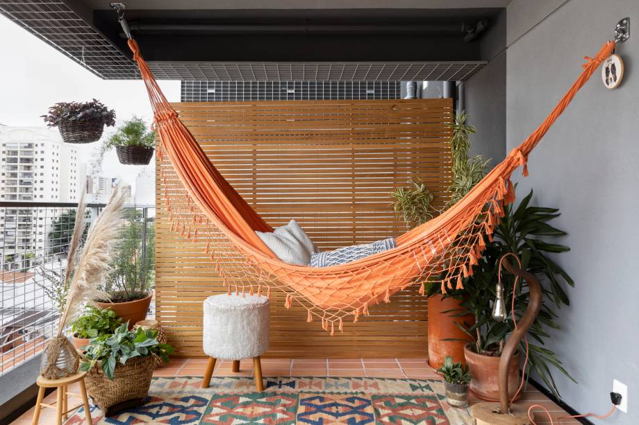 Na varanda, ficou tudo aberto conforme desejado. Para dar a privacidade com relação à varanda, foi projetado um biombo em madeira maciça. E, para dar uma atmosfera de quintal, o escritório projetou um espaço com muita planta e uma rede.
