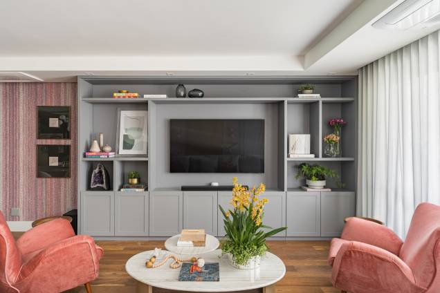 Na reforma, a sala de estar ganhou uma estante, executada pela SCA Jardim Europa e desenhada pela Spaço Interior, e que foi composta por armários sem puxadores aparentes, bem como o espaço para a TV e nichos assimétricos para os objetos decorativos. Executado em laca, o design do móvel ressalta leveza e modernidade.