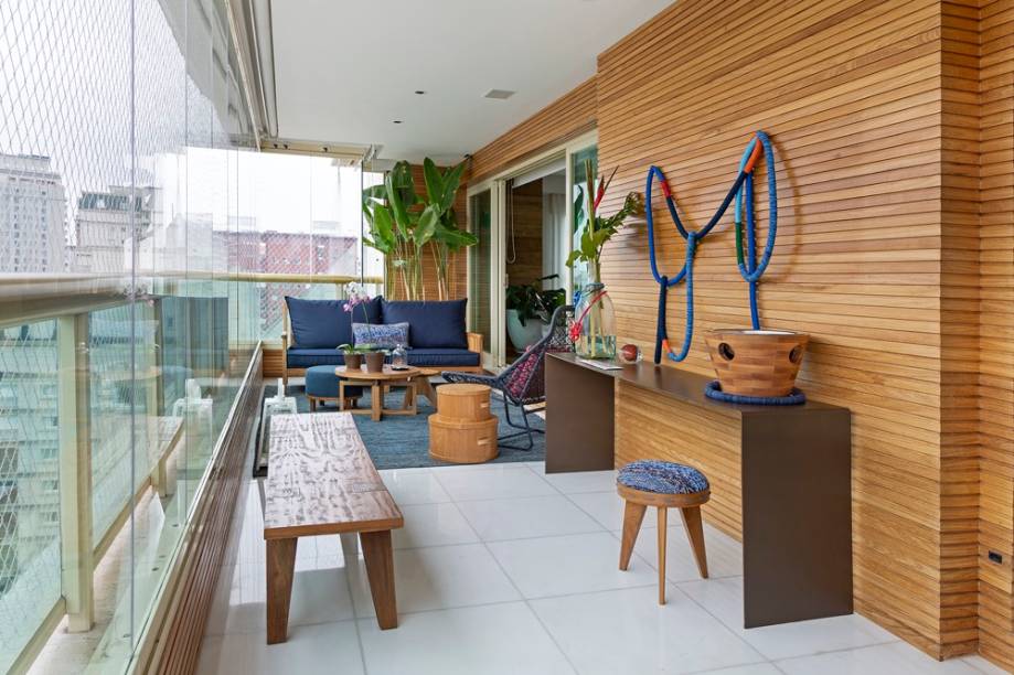 A varanda é outro destaque. Espaçoso, o ambiente ganhou ares de estar com tapete, poltrona, mesa e cadeiras. É mais uma opção para os moradores se reunirem e fazer alguns almoços e jantar com proposta mais descontraída.