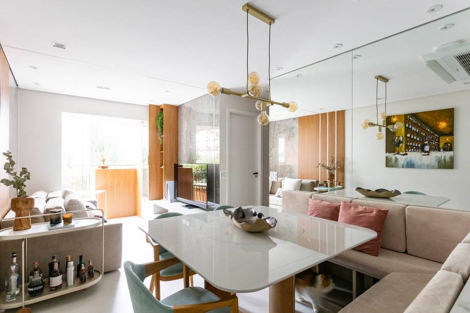 Além disso, a sala de jantar também é composta por um espelho, que contribuiu para a sensação de amplitude, e um pendente dourado, que valorizou a paleta de tons claros.