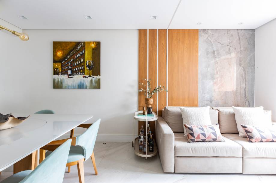 A integração foi um dos pilares da reforma do apartamento, englobando a área social, com as salas de estar e jantar, de TV, cozinha, cantinho do bar e sacada, revestidos com porcelanato acetinado de grande formato (120 x 120 cm).