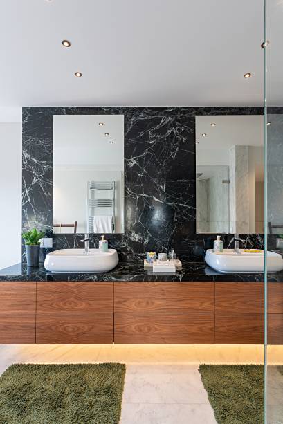Revestimentos em laca branca, mármore e madeira: conheça este apê em Portugal