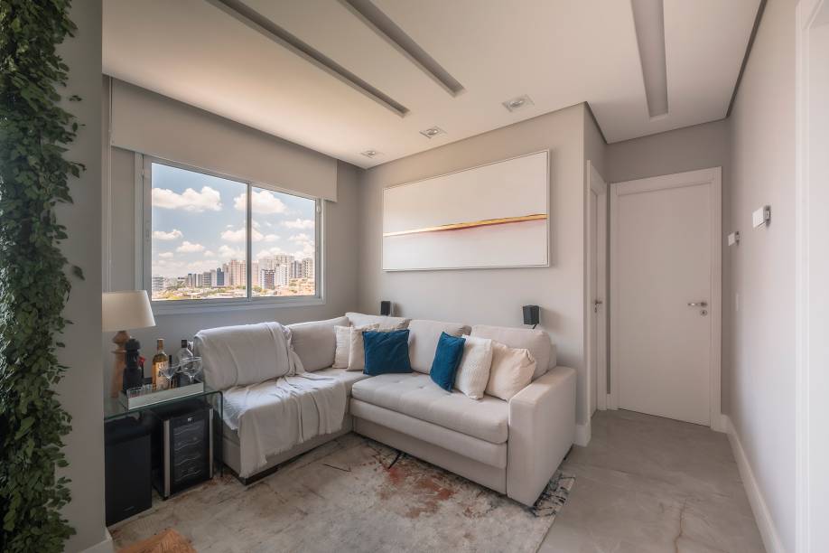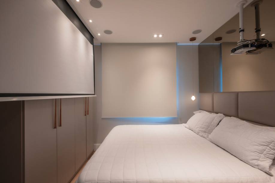 Já o quarto ganhou cabeceira estofada, espelho na para parede para dar amplitude e um home office/penteadeira embutida na marcenaria. E, como não havia um espaço suficiente para a instalação de uma TV, a solução foi recorrer ao projetor e ao telão.