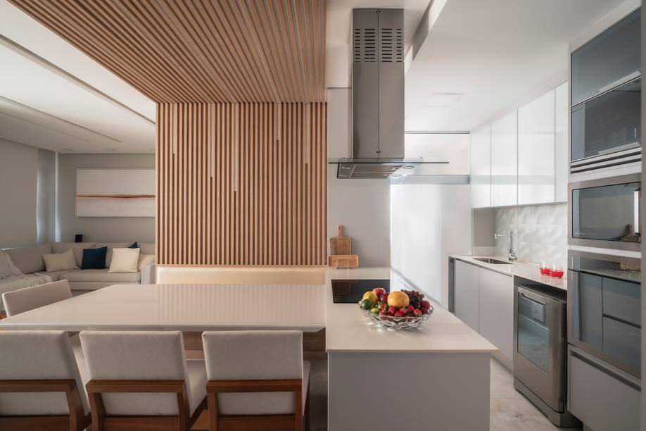 A cozinha recebeu uma ilha bem próxima da mesa de jantar, que foi revestida de quartzo branco. Multifuncional, a bancada abriga o cooktop por indução e ainda serve como apoio nas ocasiões em que recebem seus convidados.