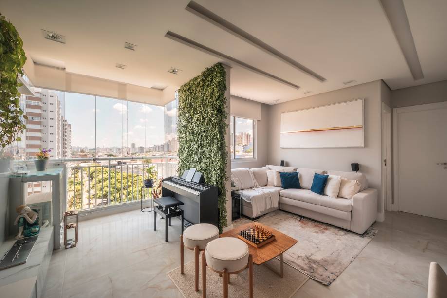 Ripas no teto e jardim vertical marcam a área social deste apê de 68m²