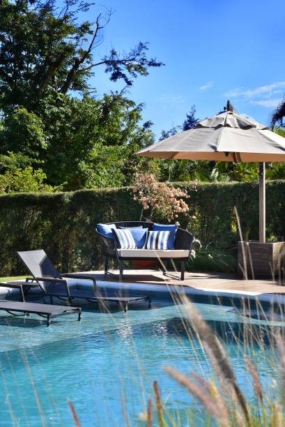 Nos detalhes que não poderiam ficar de fora, o projeto incluiu um chuveirão, vestiário para o banho pós mergulho e o oásis formado pela poltrona espaçosa protegida pelo ombrelone.