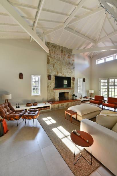 A sala de estar emana a essência rústica que é perfeita tanto para o frio, com a lareira tradicional presente na parede revestida com pedra natural, como o frescor que ela entrega para a temporada de calor. Com sua base neutra e leve, a decoração exalta o amadeirado leve do mobiliário, o sofá claro e o caramelo da poltrona Costela. “A casa ganhou um aspecto interiorano, mas sem ficar datada”, comenta a arquiteta.