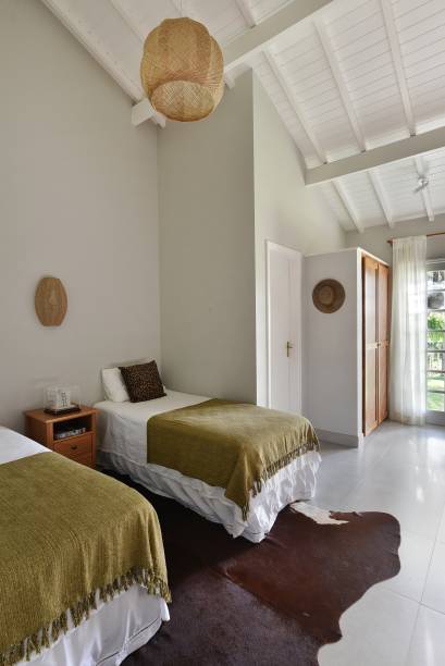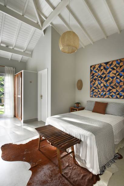 Nas referências implementadas no projeto de arquitetura de interiores, uma ampla variedade de elementos compostos por materiais naturais como a palha, bambu, madeira e barro marcam presença nas escolhas.