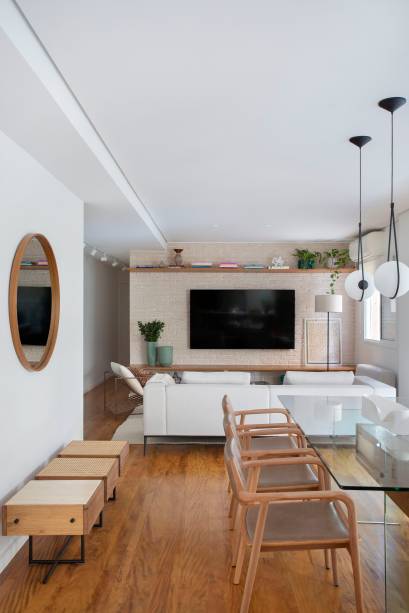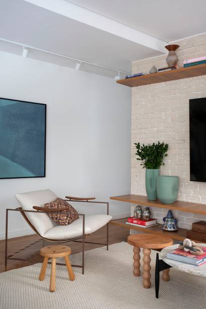 “Apostamos em materiais de diferentes texturas, sempre dentro de uma cartela de tons neutros, para criar uma atmosfera mais despojada e jovem no apartamento, assim como são os moradores. Um exemplo é do tijolinho branco que reveste a parede da tv”, explica a arquiteta Alexia.