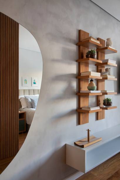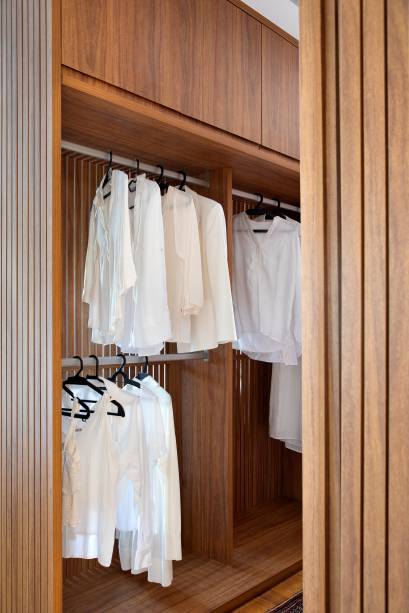 Segundo as arquitetas, outro destaque no projeto é o closet tipo “caixa”, integralmente executado em marcenaria (para evitar perda espaço), com a parte em L voltada para o quarto em ripas vazadas que permitem a entrada de luz natural e garantem a constante ventilação interna. Elas ressaltam ainda a horta vertical ao lado da ilha da cozinha, plantada em cachepôs de aço cortén, fixados no painel de madeira ripada.