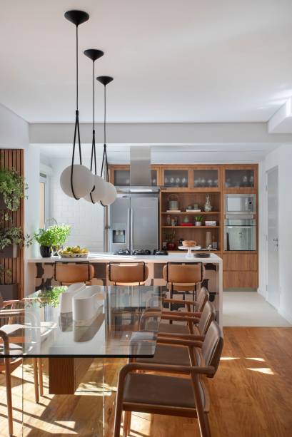 “Já a conexão do casal com o Rio de Janeiro aparece na ilha da cozinha, que foi revestida com azulejo Ipanema, da Portobello, com estampa que remete ao calçadão da famosa praia carioca”, acrescenta a sócia Juliana.