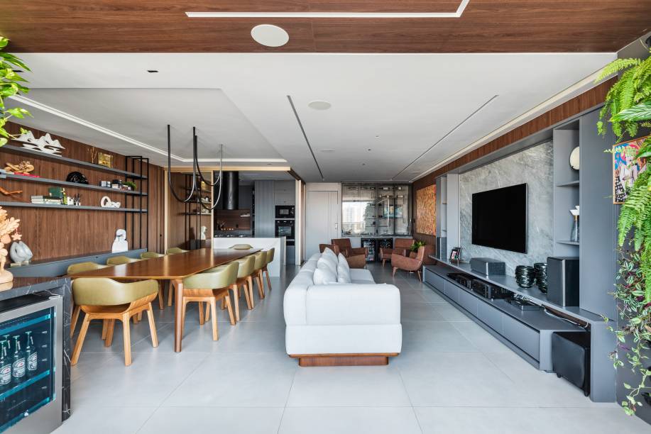 Desenvolvido desde a planta, o projeto levou três meses para a concepção e dois anos para a execução. Apaixonado por culinária, o proprietário desejava um ambiente onde pudesse cozinhar enquanto interagia com os convidados. Para isso, a cozinha foi integrada à sala de estar, com o cooktop estrategicamente posicionado de frente para o living. Grandes portas de correr garantem a flexibilidade de isolar o ambiente sempre que necessário.