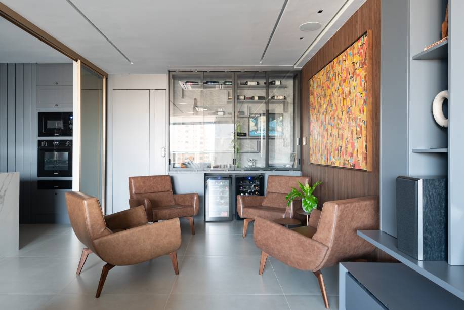 Outro destaque do projeto é a sala de vinhos, posicionada logo na entrada do apartamento. Como colecionadores e apreciadores, os moradores ganharam um espaço exclusivo, com uma estante projetada para que os rótulos fizessem parte da decoração. O ambiente conta ainda com poltronas de couro aconchegantes e uma vitrola estrategicamente posicionada para enriquecer a experiência sensorial.