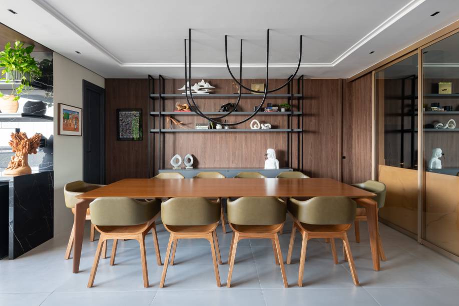 A sala de jantar conta com uma mesa ampla, ideal para os jantares elaborados do anfitrião, enquanto a cozinha, além de funcional, traz detalhes sofisticados que valorizam a experiência gastronômica.