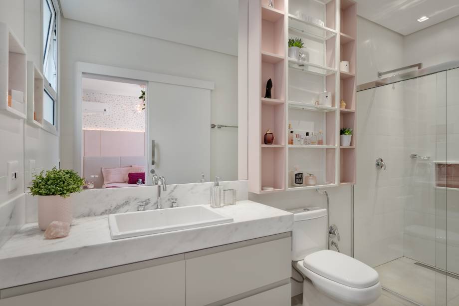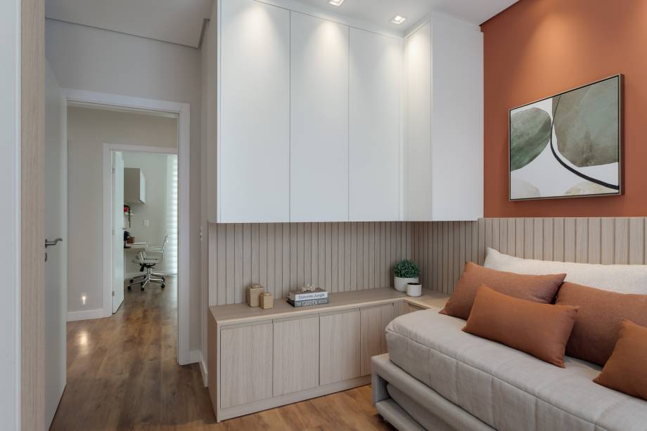 Na área íntima da casa há um home office, quarto de visitas, suíte da filha e suíte do casal. Todos esses ambientes seguem o estilo do resto da casa, com a mesma paleta de cores.