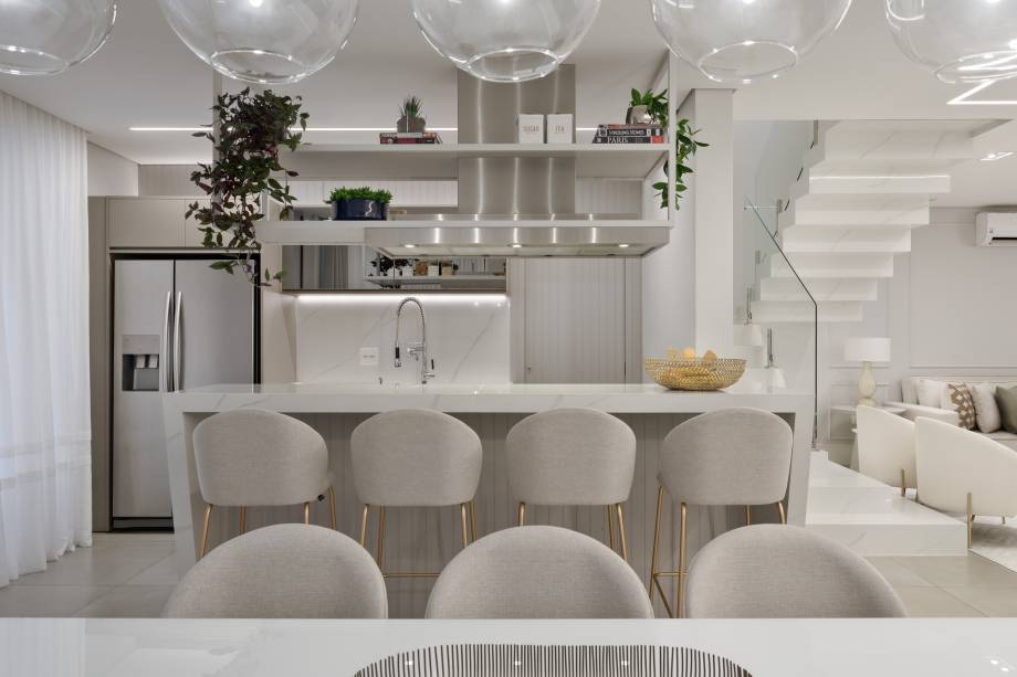 “Uma coisa engraçada é que o esposo não queria reformar a escada e a moradora queria muito. Eu também concordava em mudar, pois era uma escada com material escuro e estava em uma localização imponente dentro do ambiente. Fizemos o projeto e ele amou, amou mais ainda quando viu a escada pronta”, explica a arquiteta Carolina Dallagrana, que responsável pela residência.