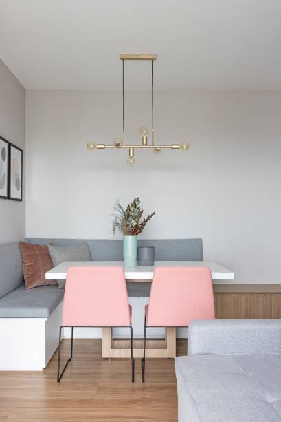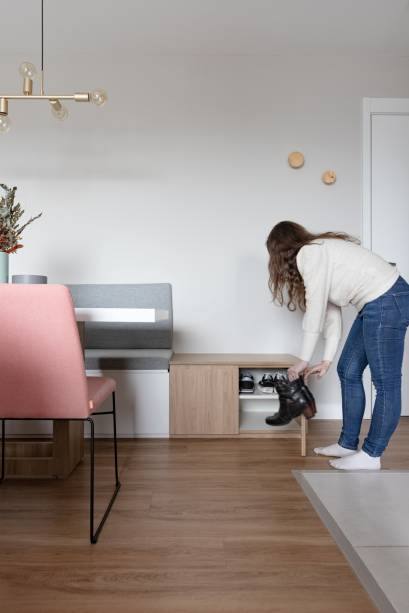 A sala de jantar apresenta um canto alemão para maximizar o espaço e servir como uma sapateira. Esse cantinho se tornou um local funcional para sentar, tirar os sapatos e guardá-los.