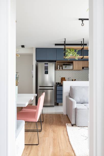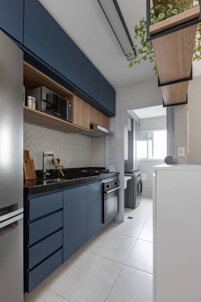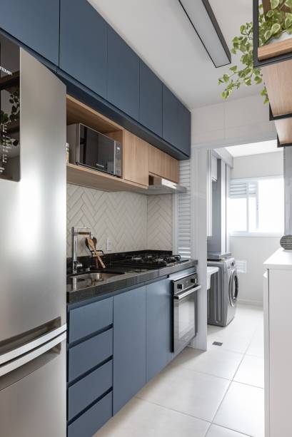 A cozinha foi projetada com uma cor mais escura, servindo como pano de fundo para a sala de estar. Essa escolha teve o propósito de harmonizar com o piso e a bancada entregues pela construtora. O azul marinho equilibra a cor escura da marcenaria com o branco do azulejo e detalhes em madeira.