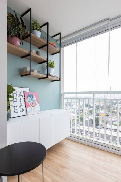 A varanda, embora compacta, foi projetada com espaço de armazenamento adicional, incluindo um pequeno banco com gavetas e um aparador com portas. Uma estrutura de serralheria permite o cultivo de plantas, mantendo o espaço aberto para futuras adições, como uma poltrona.
