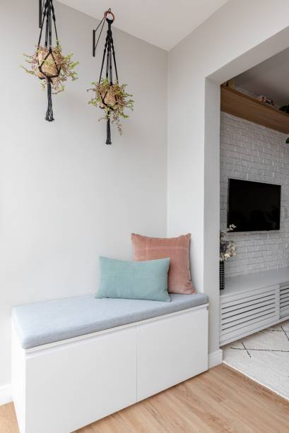Sem quebra-quebra, apê de 53 m² ganha cores e canto alemão com sapateira