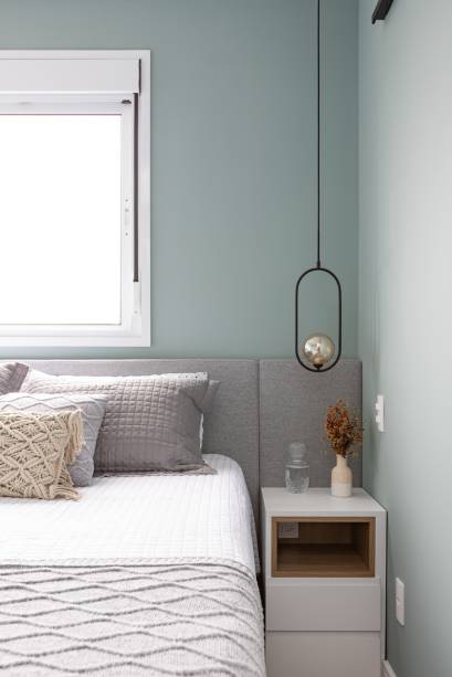A suíte recebeu uma paleta de cores relaxantes, com destaque para o verde azulado. O layout foi cuidadosamente planejado para maximizar o espaço de armazenamento, com uma cama posicionada à frente da janela. Cada lado da cama foi projetado para máxima funcionalidade, incluindo uma mesa móvel para acesso ao armário e uma pequena mesa de cabeceira sob medida.