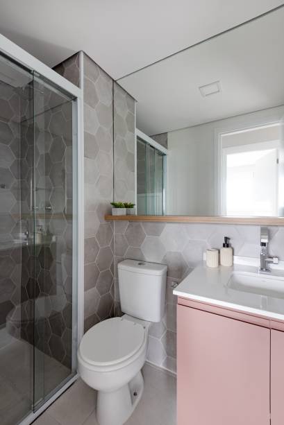 Os banheiros mantiveram o piso entregue pela construtora, com a substituição das bancadas e do revestimento da parede. Cada banheiro recebeu uma abordagem personalizada de marcenaria para atender às necessidades específicas, incluindo espelhos grandes, prateleiras decorativas e gavetões para roupas sujas.