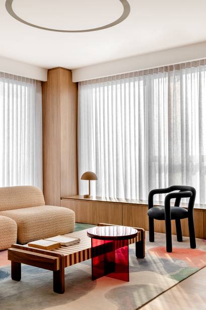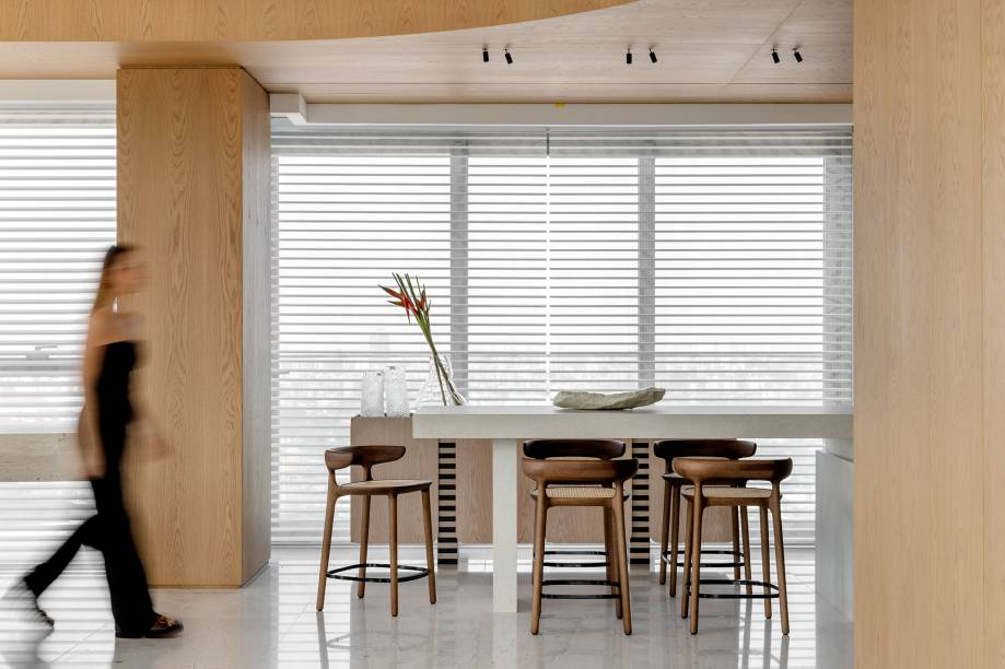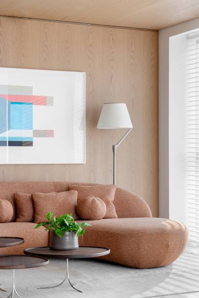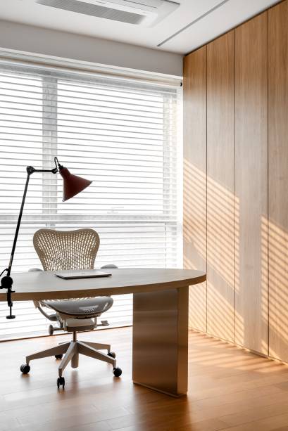 Para equilibrar a estrutura fria da pele de vidro que compõe a arquitetura do edifício, as arquitetas incorporaram madeira natural na marcenaria e no mobiliário, além de texturas e tramas variadas para tornar os ambientes mais acolhedores.