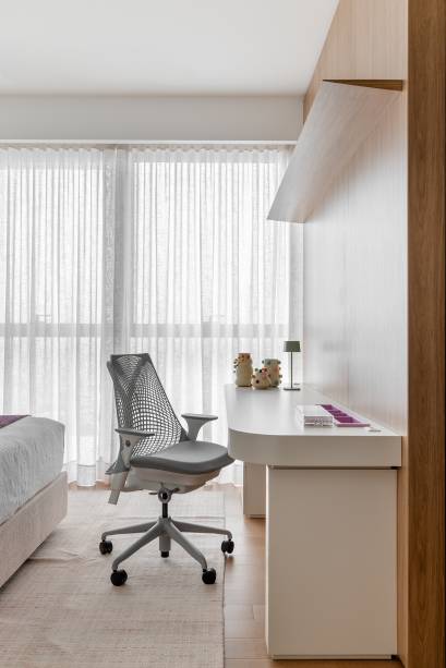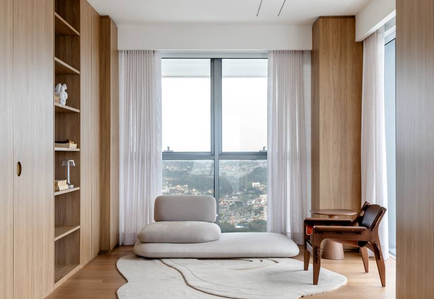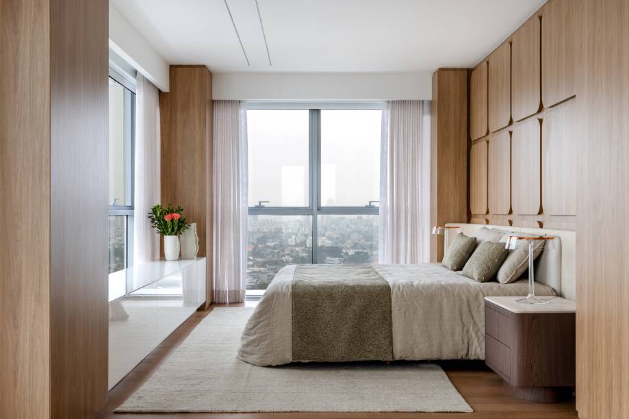 A suíte principal, com uma vista deslumbrante da cidade, é um convite ao relaxamento. A cama foi estrategicamente posicionada para contemplar a paisagem urbana, tornando-se o centro das atenções. O uso do Carvalho Americano confere sofisticação e atemporalidade ao ambiente, transformando-o em um verdadeiro refúgio urbano. O painel da cama, com design orgânico e laterais curvas, complementa a composição e reforça a sensação de aconchego e elegância.