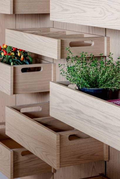 Diante da limitação de espaço para um armário convencional, as arquitetas desenvolveram um inovador sistema de caixas encaixadas em um painel de madeira. Essas caixas podem ser retiradas e utilizadas sobre as bancadas, garantindo praticidade e flexibilidade.