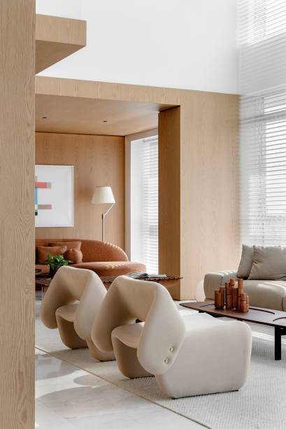 Com um pé-direito de 6 metros e uma vista privilegiada, o living é o ponto central do apartamento. A curadoria de móveis inclui peças icônicas do design brasileiro, combinando diferentes materiais e texturas. A paleta em tons terrosos contrasta elegantemente com os tons claros do piso e da madeira, criando um ambiente sofisticado.