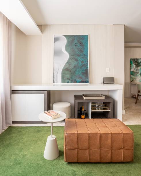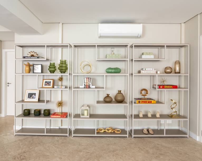 O local também conta com um armário com nichos, para acomodar os livros adquiridos em viagens e ao longo dos anos, conferindo um toque pessoal e acolhedor ao ambiente.