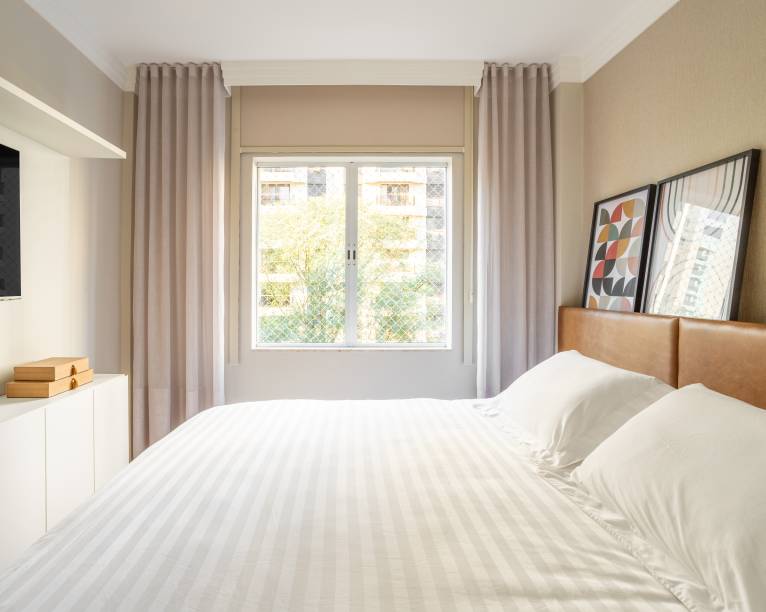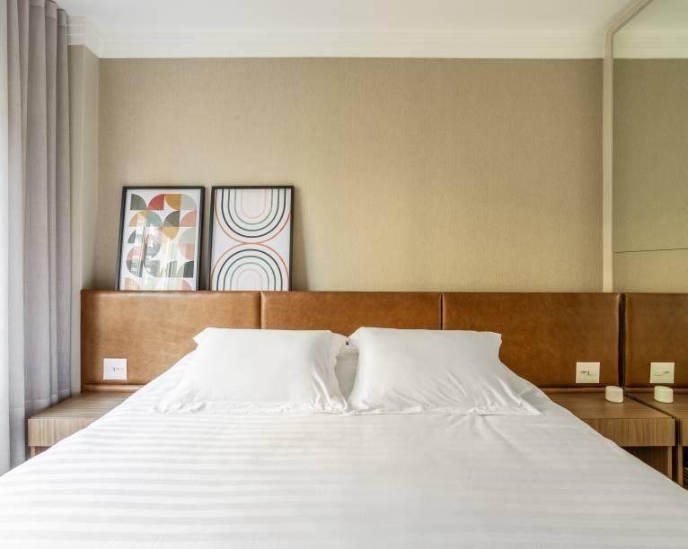 A suíte master foi pensada com tons claros visando transmitir uma sensação de tranquilidade. O closet foi desenvolvido em marcenaria com textura de linho para proporcionar amplitude e leveza. A cabeceira em couro adiciona um toque de sofisticação e elegância ao dormitório.