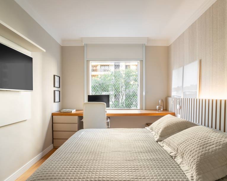 Já o quarto de hóspedes foi desenvolvido especialmente para receber os pais do casal, apresentando uma paleta de cores neutras, iluminação indireta suave e uma bancada de apoio, ideal para receber de maneira confortável.