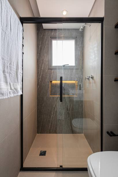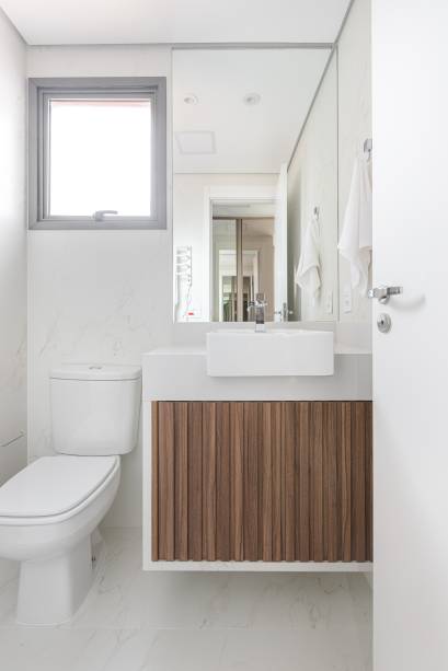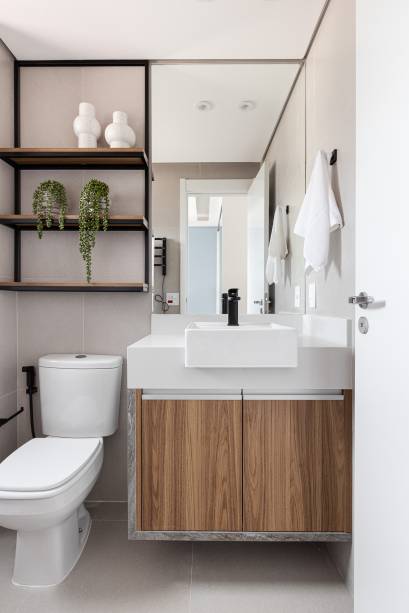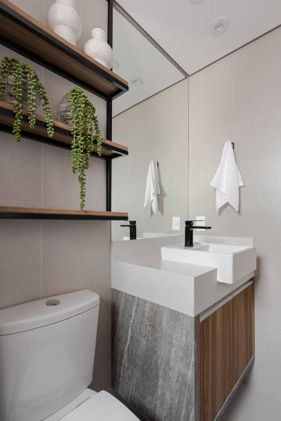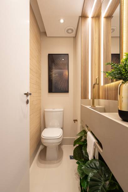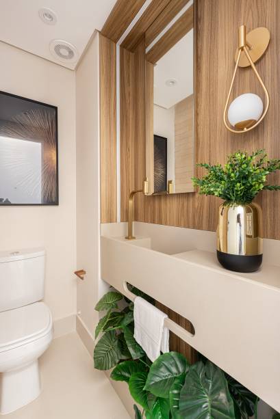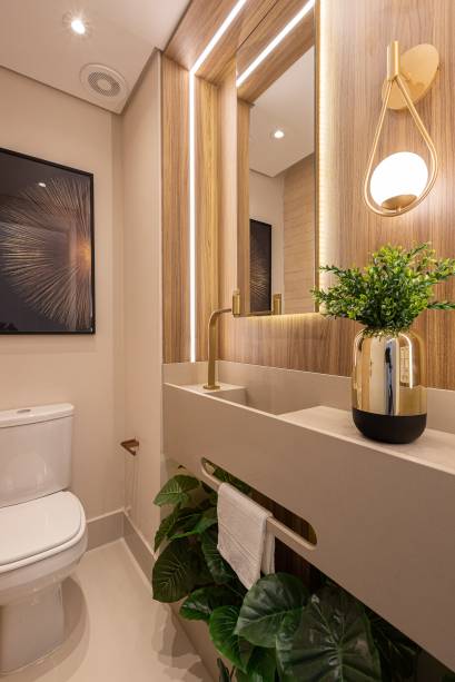 O lavabo, com metais dourados e tijolinhos rústicos, finaliza o apartamento, mostrando que até os menores ambientes podem ter grande impacto na decoração e funcionalidade do espaço.