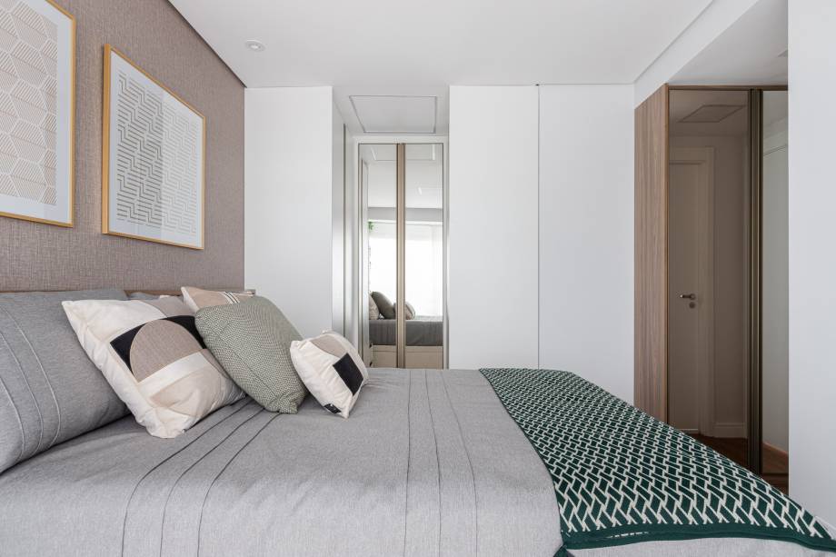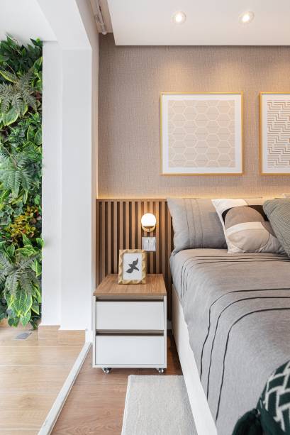 A suíte master foi pensada como um refúgio íntimo e relaxante. A integração com a varanda, por meio de um jardim vertical, oferece um cantinho especial para relaxamento ou para trabalho.