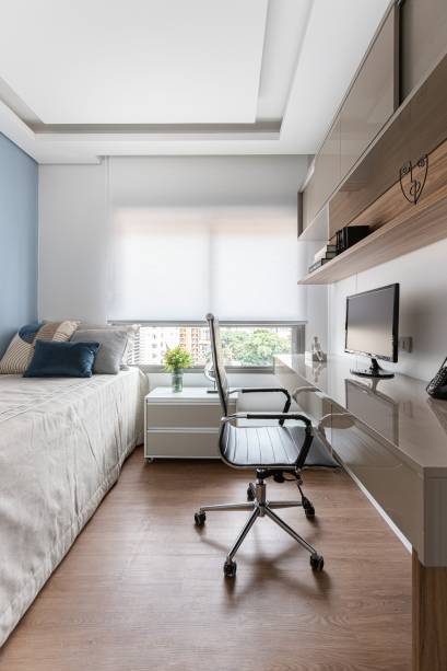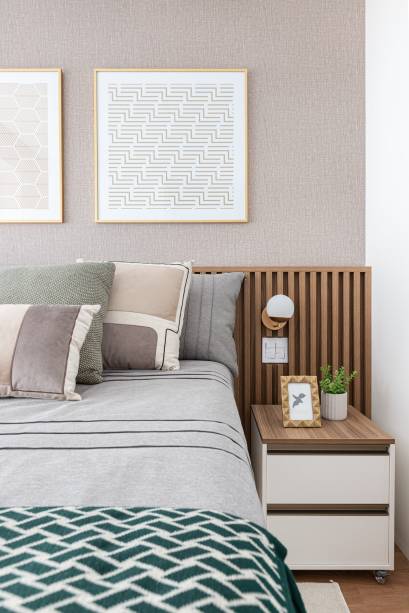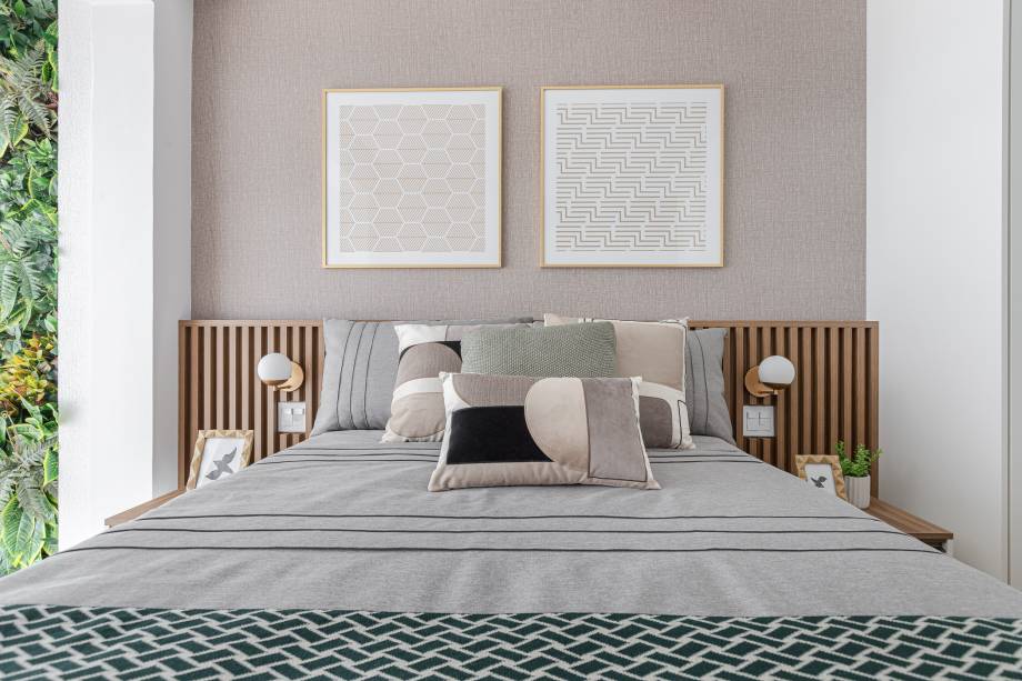 O papel de parede em linho e a cabeceira ripada garantem conforto e sofisticação, ao mesmo tempo em que aproveitam ao máximo a luz natural.
