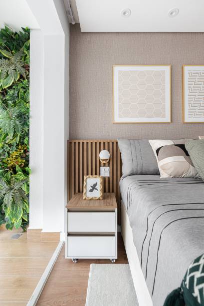 Suíte de apartamento de 72 m² tem varandinha com jardim vertical