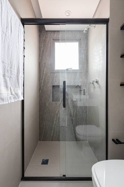 Além disso, o projeto pensou em todos os detalhes, como uma área de serviço organizada e discreta, onde os equipamentos ficam escondidos, garantindo praticidade sem abrir mão do design.