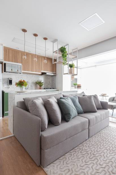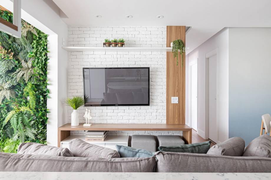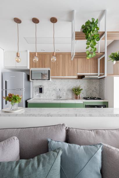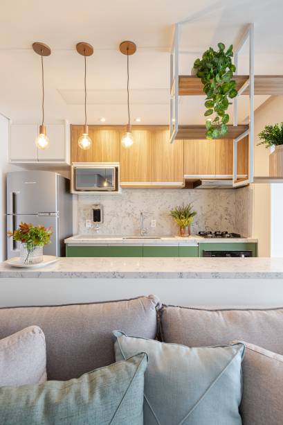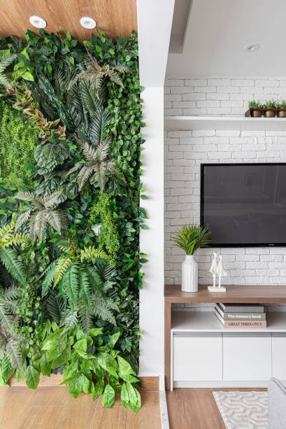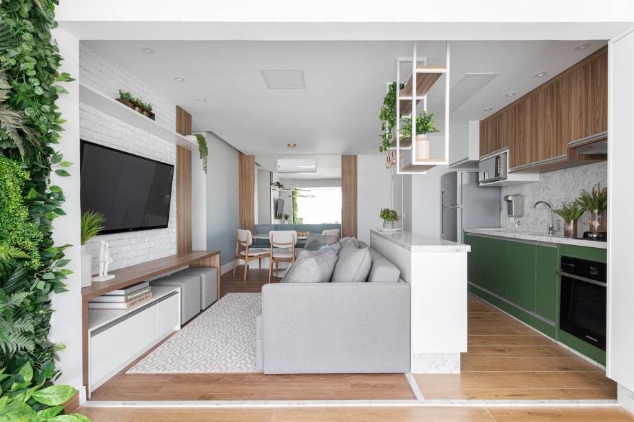 O projeto de RMV Interiores criou ambientes fluidos, jardins verticais e uma cozinha com marcenaria em MDF verde.